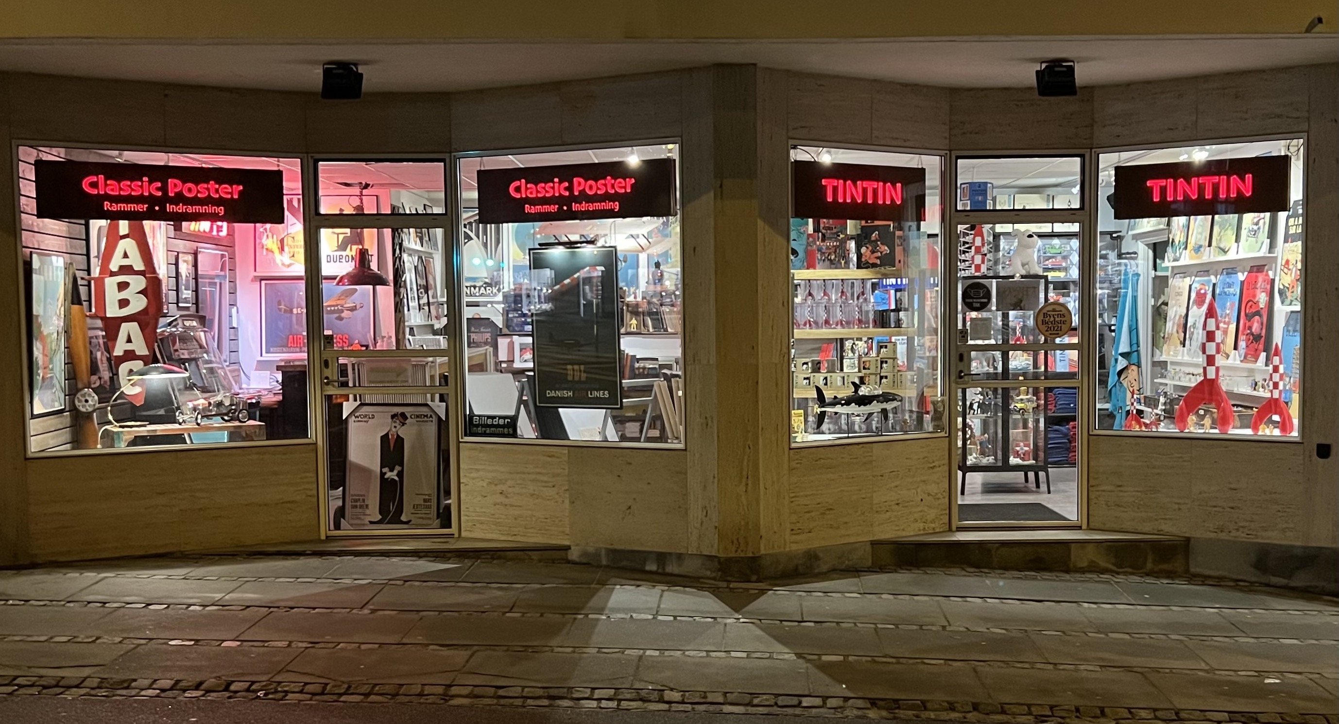 Befinder sig i Aarhus på Skovvejen 46, 8000 Aarhus C, ved Trøjborg. Butikken hvor du i dag finder Tintin & Filmplakaten har eksisteret siden 2006, hvor den startede som galleri og senere hen gik over til at handle med originale filmplakater. Den fantastiske Tintin og hans vidunderlige eventyr, blev en del af forretningen omkring 2013 og Tintin har siden været en stor del af forretningens identitet. Navnet Tintin & Filmplakaten kommer sig af de to webshops www.Tintin-Butik.dk og www.Filmplakaten.com, som begge er en og samme forretning, på Skovvejen i Aarhus.